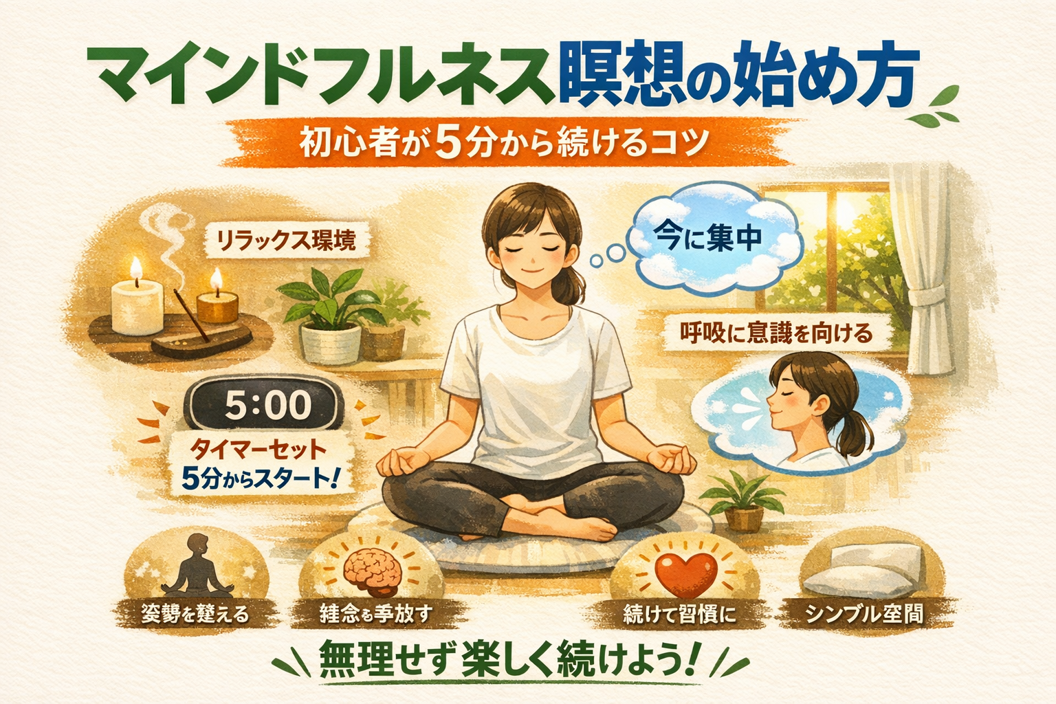 「毎日30分やらなきゃ」と気負う必要はありません。最初はたった5分でも十分です。慣れてきたら、10分、15分と少しずつ時間を延ばしていきましょう。完璧な瞑想なんてありません。ただ座るだけでOKです。 - コツ 2: 決まった時間・場所を設ける