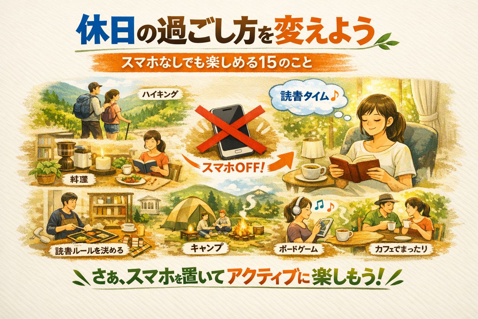 ぜひ、次のお休みにはスマホを置いて、今回ご紹介した活動の中から気になる一つを実践してみてください。